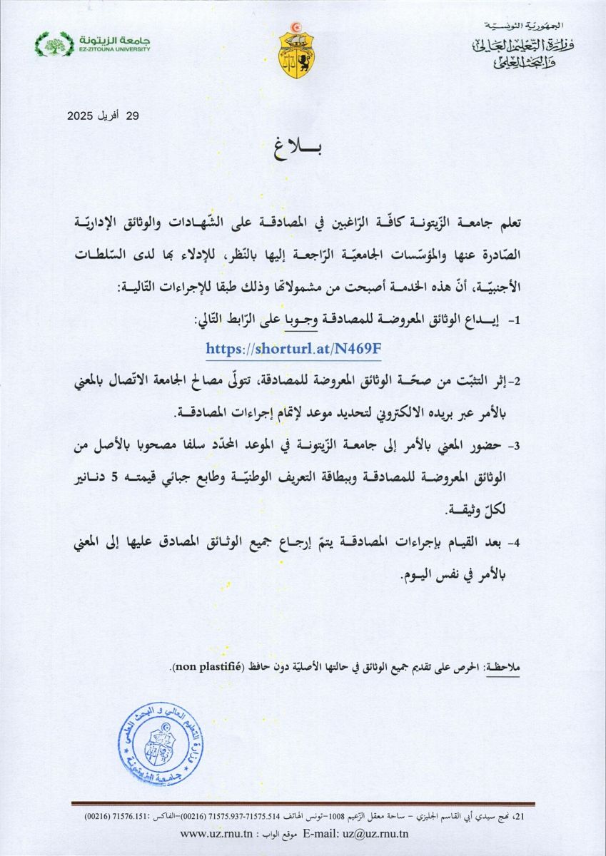 Approbation des diplômes et documents administratifs émis par l’Université de Zitouna et ses établissements affiliés